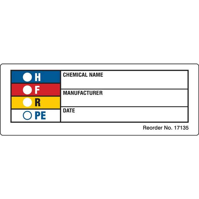 Brady® | Bulk | Active | Pre-Printed | English | Facility | Safety | Text Only | H F R Pe Chemical Name. Manufacturer. Date. | No Symbol | White | Black, Blue, Red, Yellow | 3.125" (79.38mm) | 1.130" (28.70mm) | - | - | Paper | Adhesive | - | - | Rectangle | - |