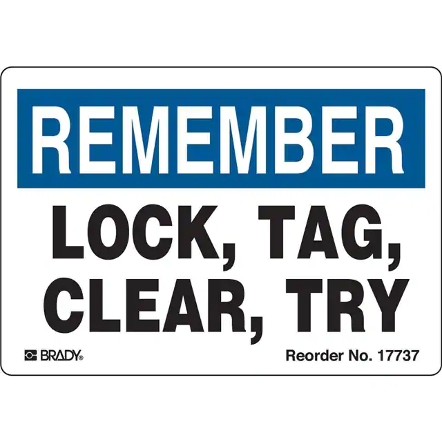 Brady® | Bulk | Active | Pre-Printed | English | General | Lock Out | Text Only | Remember. Lock, Tag, Clear, Try | No Symbol | White | Black, Blue | 5.000" (127.00mm) | 3.500" (88.90mm) | - | Outdoor | Vinyl | Adhesive | - | - | Rectangle | - |