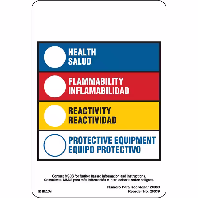 Brady® | Bulk | Active | Pre-Printed | English | Facility | Notice | Text Only | Health/Salud, Flammability/Inflamabilidad, Reactivity/Reactividad, Protective Equipment/Equipo Protectivo | No Symbol | White | Black, Blue, Red, Yellow | 5.875" (149.23mm) | 4.000" (101.60mm) | - | - | Paper | Adhesive, Permanent | - | - | Rectangle | - |