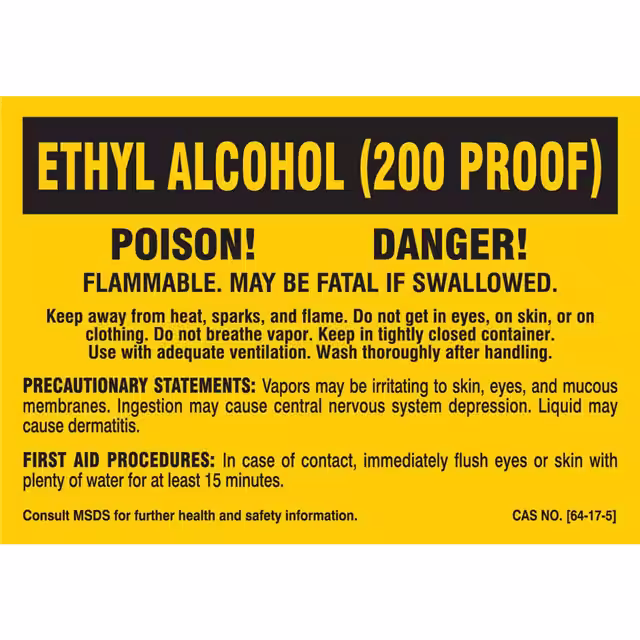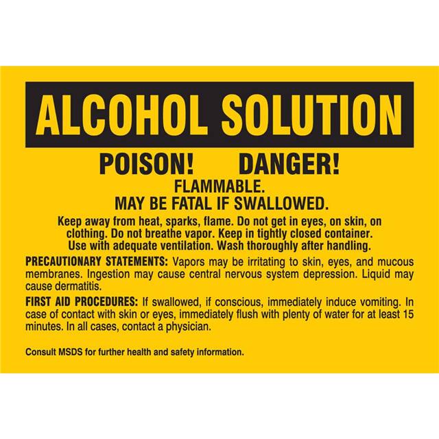 Brady® | Bulk | Active | Pre-Printed | English | Facility | Safety: Danger | Text Only | Ethanol(200Proof). Poison. Danger. Flammable. May Be Fatal If Swallowed. | No Symbol | Yellow | Black | 5.000" (127.00mm) | 3.500" (88.90mm) | - | Outdoor | Polyester (PET) | Adhesive | - | - | Rectangle | - |