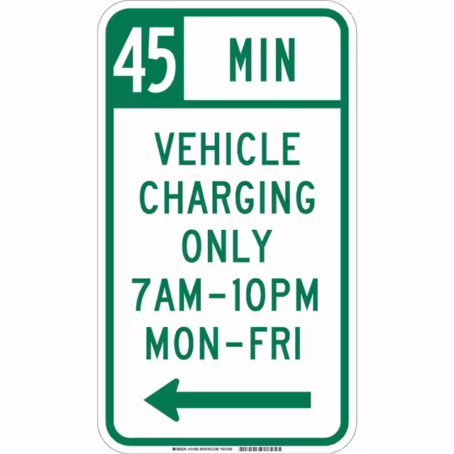 Brady® | Bulk | Active | Green Legend, White Background | Warning | Aluminum | 45 Min Vehicle Charging Only 7 Am-10 Pm Mon-Fri | 18.00" L x 12.00" W (457.2mm x 304.8mm) |