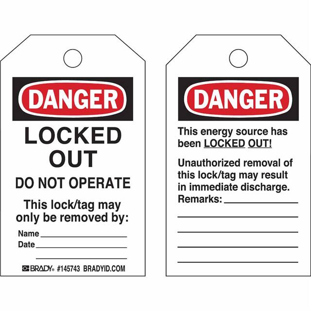 Brady® | Bulk | Active | Black and Red Legend, White Background | Danger | Polypropylene | Danger. Locked Out Do Not Operate This Lock/Tag May Only Be Removed By. Name. Date. | 5.00" L x 3.00" W (127.0mm x 76.2mm) |