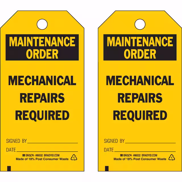 Brady® | Bulk | Active | Black Legend, Yellow Background | - | Paper | Mechanical Repairs Required Signed By. Date, Mechanical Repairs Required Signed By. Date. | 5.75" L x 3.00" W (146.0mm x 76.2mm) |