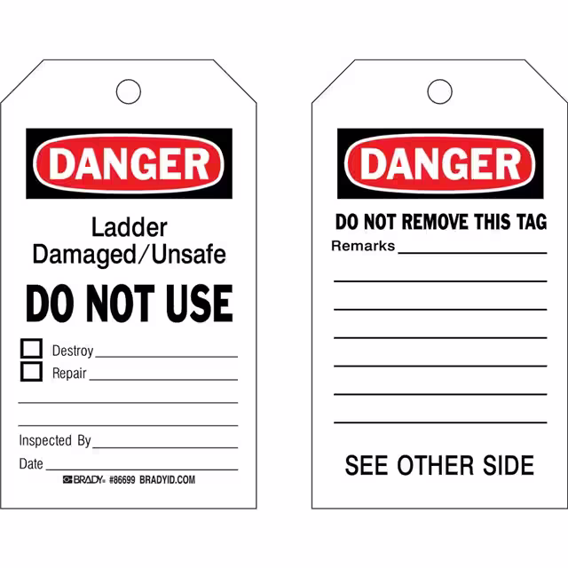 Brady® | Bulk | Active | Black and Red Legend, White Background | - | Paper | Ladder Damaged/Unsafe Do Not Use. Destroy. Repair Inspected By. Date. | 7.00" L x 4.00" W (177.8mm x 101.6mm) |