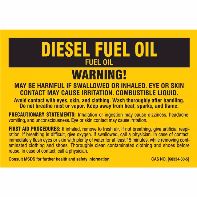 Brady® | Bulk | Active | Pre-Printed | English | Facility | Safety: Warning | Text Only | Diesel Fuel Oil. Warning. May Be Harmful If Swallowed Or Inhaled. Eye Or Skin Contact May Cause Irritation. Combustible Liquid | No Symbol | Yellow | Black | 10.000" (254.00mm) | 7.000" (177.80mm) | - | Outdoor | Polyester (PET) | Adhesive | - | - | Rectangle | - |