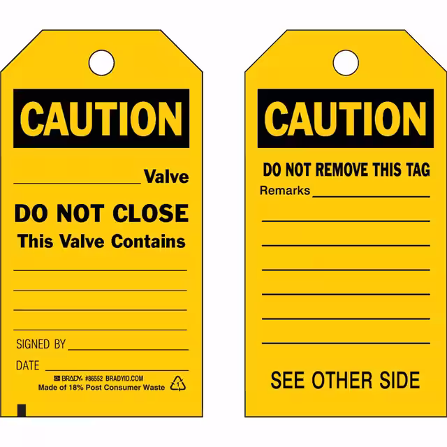 Brady® | Bulk | Active | Black Legend, Yellow Background | Caution | Polyester | Caution. Do Not Close This Valve Signed By. Date. | 5.75" L x 3.00" W (146.0mm x 76.2mm) |